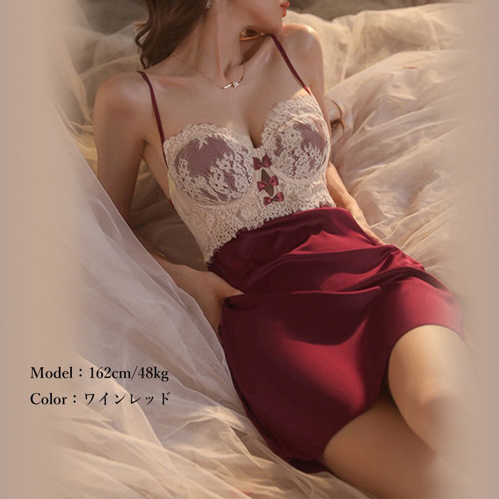 セクシー 胸元 キャミワンピース 春夏 レースネグリジェ 背中魅せ エッチな下着可愛い ルームウェア サテン風 勝負下着